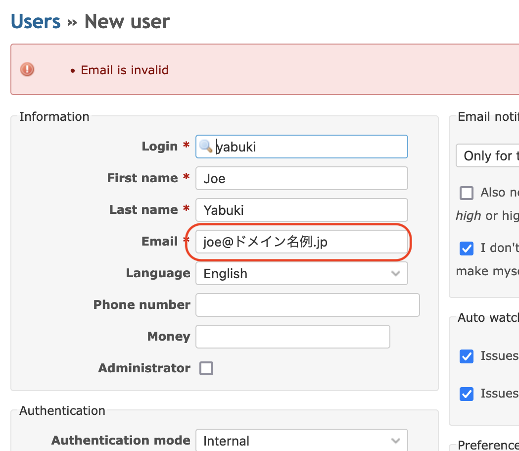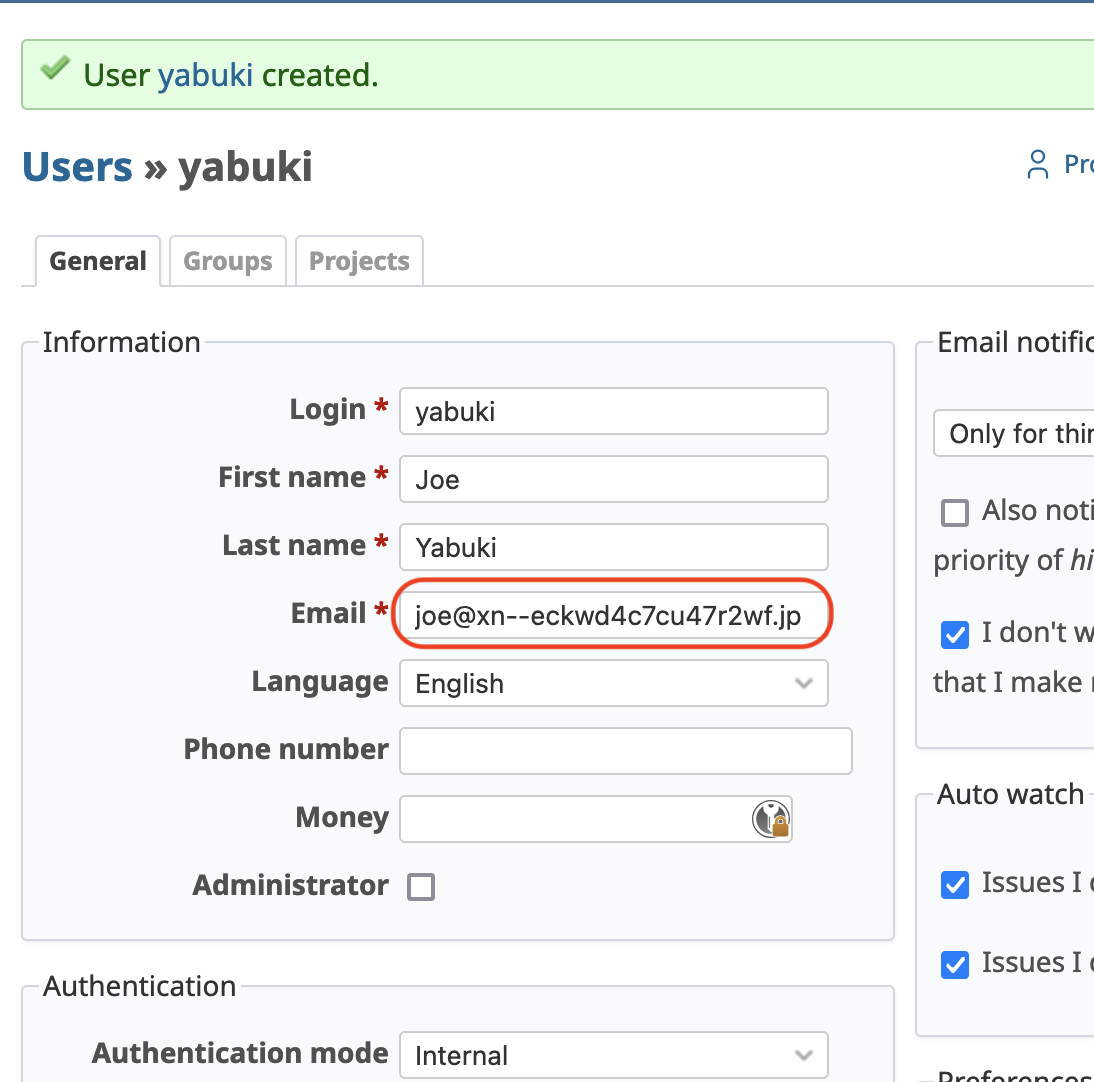 Starting from Redmine 6.0, IDN (Internationalized Domain Name) email addresses such as "joe@ドメイン名例.jp" and their ASCII representation "joe@xn--eckwd4c7cu47r2wf.jp" are supported for creating and updating user accounts.