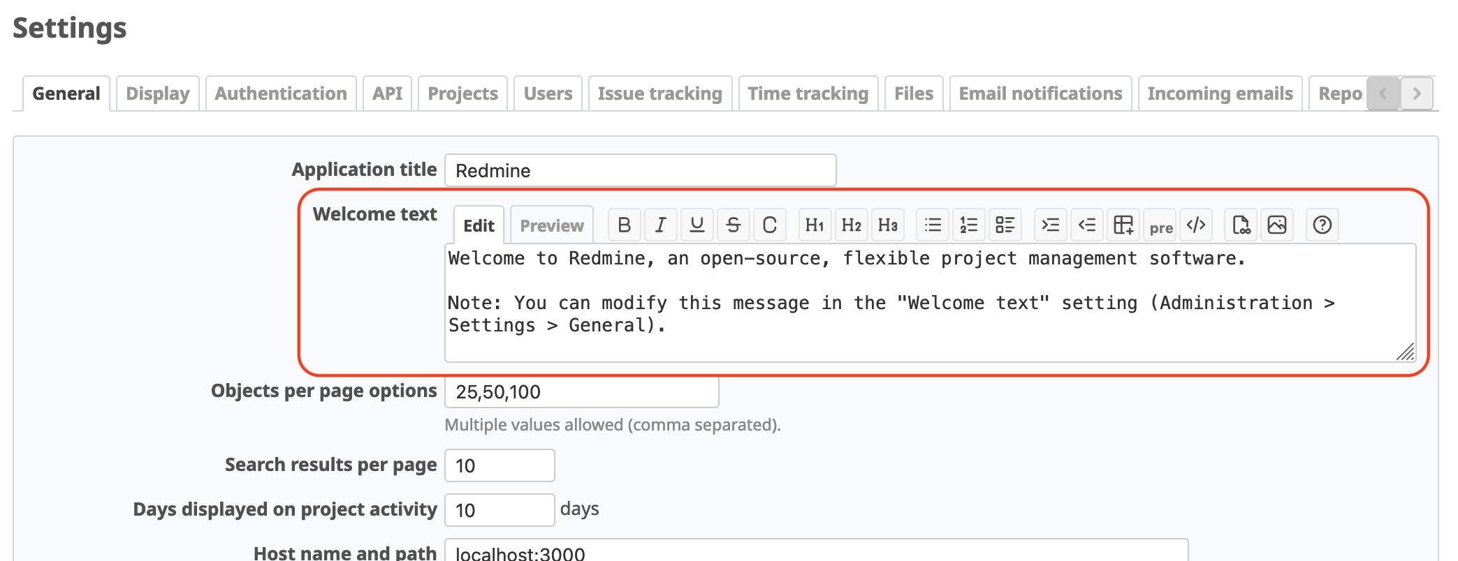 The 'Welcome text' is a feature for displaying information such as Redmine's operational policies or usage guidelines that you want all users to be aware of. Like issues and Wiki, it supports CommonMark Markdown or Textile syntax, allowing you to include images or links to Wiki pages.