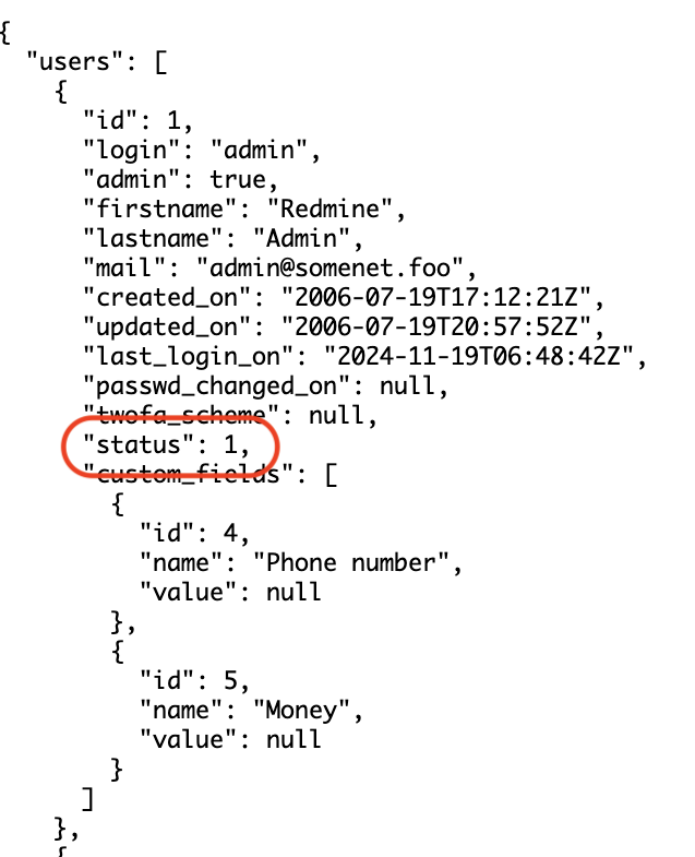 Starting with Redmine 6.0, user status information is now included in the response.