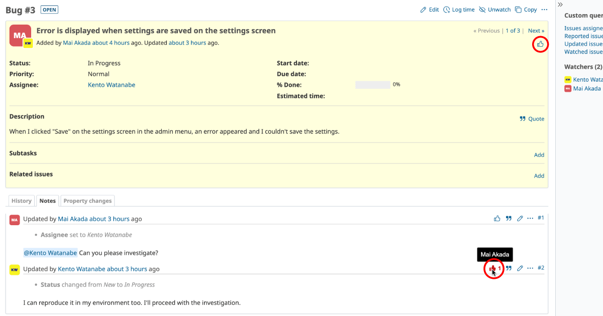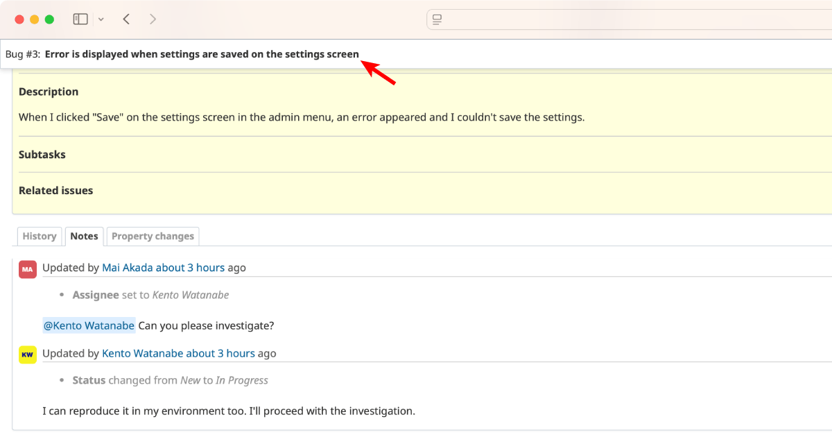 In the previous issue view, the issue subject was displayed at the very top of the page. This meant that if you scrolled down, the subject could disappear from view. This was especially true when you clicked "Edit" to modify an issue, as you were taken directly to the edit area where the editing screen appeared at the very top, making the subject invisible. If you had multiple issue screens open, there was a risk of accidentally updating the wrong issue.