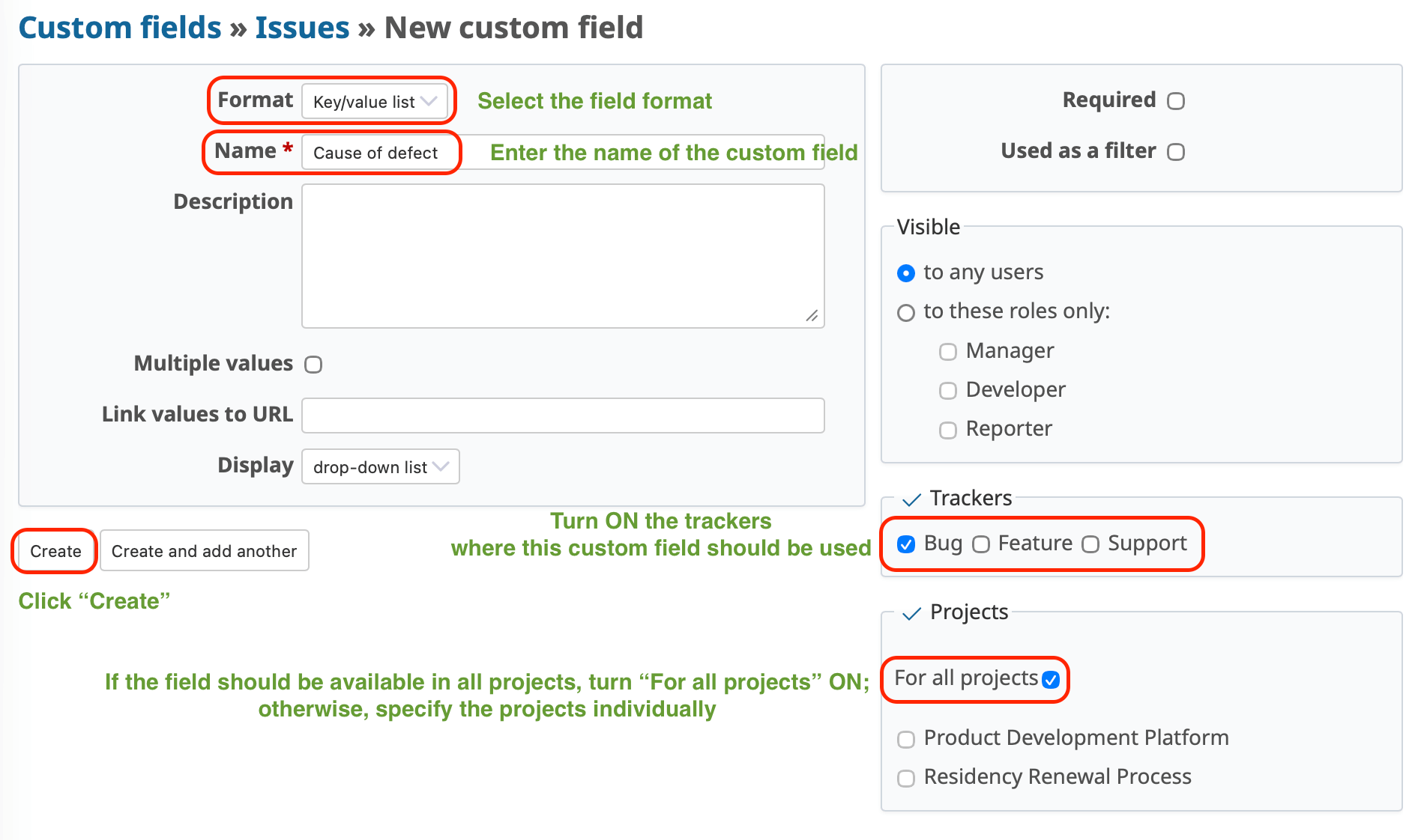 The following example explains how to create a custom field for issues.