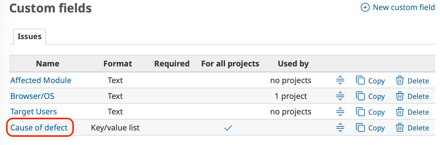For example, you might add a custom field named “Cause of defect” to the Bug tracker to classify the root cause of each software issue.
