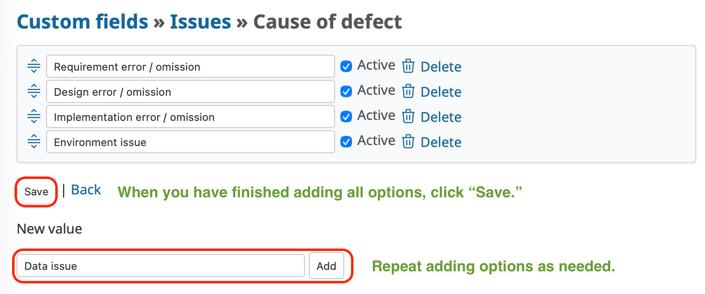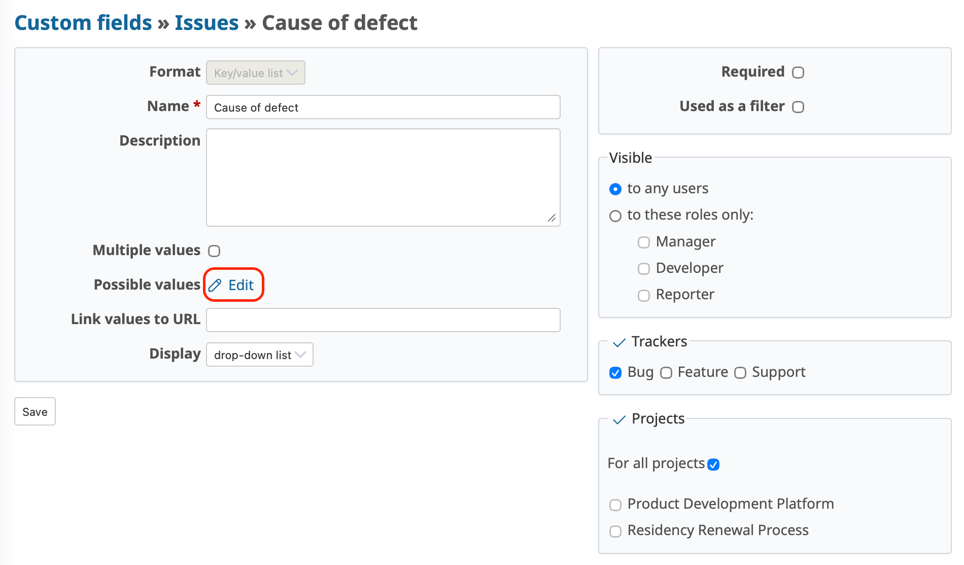 | List | A legacy option similar to Key/value list. For Redmine 3.2 and later, use Key/value list instead. Values cannot be renamed (only added or deleted). |